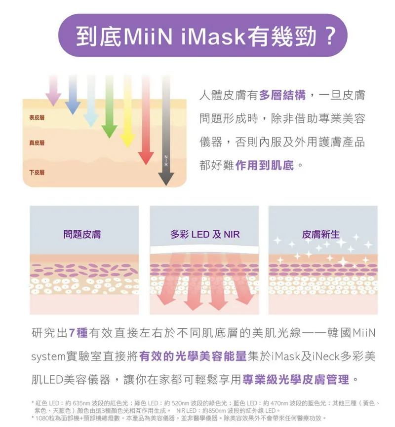 白色及玫瑰金的MiiN iMask面罩可釋出6款高輸出的LED及NIR光源,以不同光波波段滲透不同肌膚層,刺激細胞生長及重組膠原組織, 不同光波光線同時照射皮膚,可方便地一次過照顧到不同的皮膚問題。光線不含對皮膚有害的紫外線,可以放心不會令皮膚曬黑。