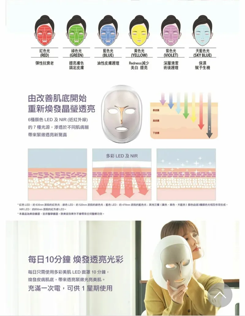 由藍色和紅色雙頻結合,加促皮膚新陳代謝,為皮膚補充能量,深層潔淨毛孔及皮膚,幫肌膚排毒,修復及緊緻肌膚。