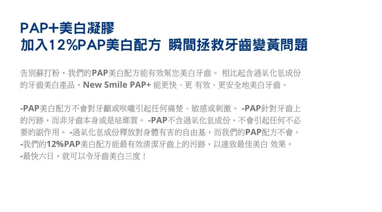 NEW SMILE藍光美白(BLUE LIGHT THERAPY)是利用高強度的藍光當作催化劑,催化美白藥劑滲入象牙質,排除沉澱的色素。 藍光漂牙一般被認為是快速、安全、持續時間長、效果顯著的漂牙方式。配搭不含過氧化氫的New Smile PAP配方(Phthalimido-Peroxy-Caproic acid),它不會忍起疼痛和敏感,而且比較溫和,能有效、安全地美白牙齒。在提升美白效能之餘亦避免了用家出現化學性灼傷。