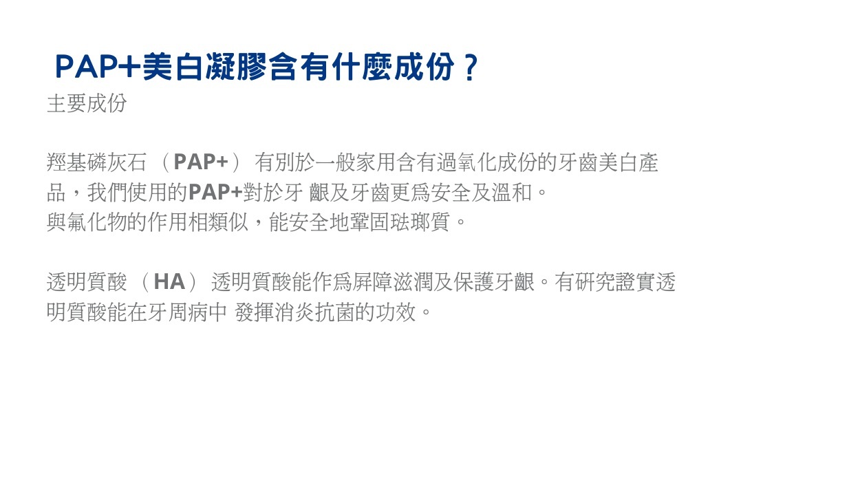 3.扭轉PAP+美白液,大約黃豆的份量塗一至兩隻牙齒,開啟藍光波段療程,10分鐘後可清水漱口吐出。(PAP美白精華含HAp、HA對於牙齦及牙齒美白更溫和,安全地鞏固琺瑯質)