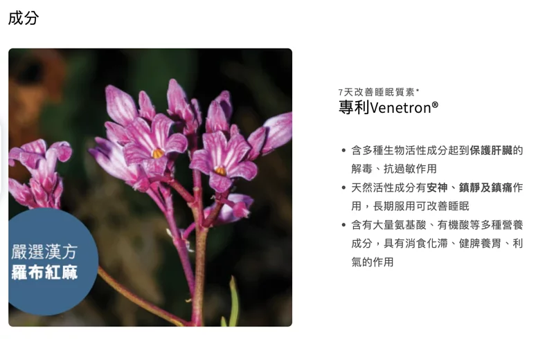 「一錠入眠」的主要成分包括專利Venetron®、小球藻、瑪卡、GABA和羅布麻葉。