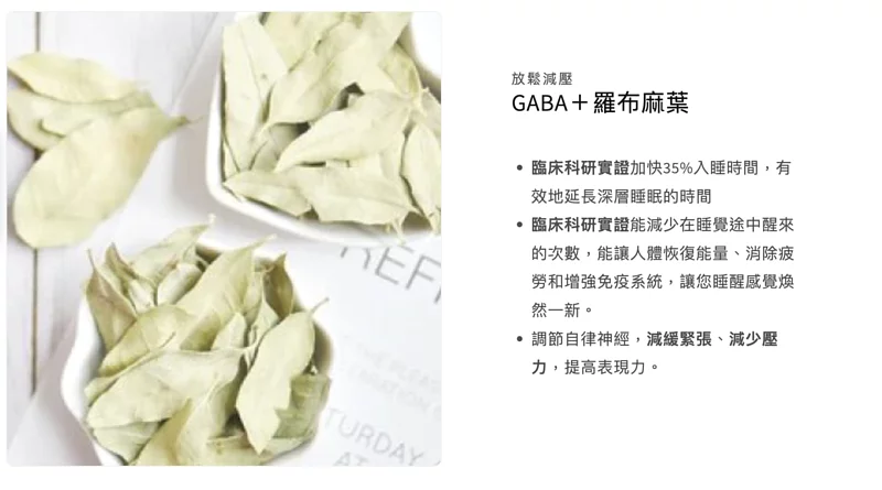 GABA是一種神經傳導物質,能夠調節自律神經,減緩緊張、減少壓力,提高表現力。羅布麻葉具有鎮靜、鎮痛、消炎等功效,可以幫助放鬆身心,減輕焦慮和幫助入眠。結合作用可以加快入睡時間,延長深層睡眠時間,減少在睡覺途中醒來的次數,並能讓人體恢復能量、消除疲勞和增強免疫系統,讓您睡醒感覺煥然一新。