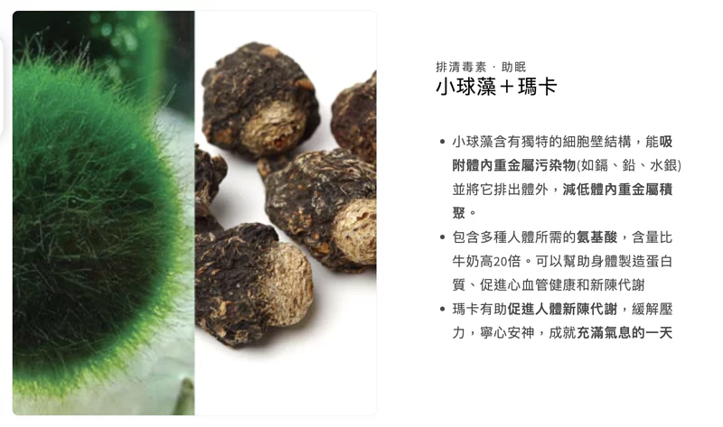 小球藻含有獨特的細胞壁結構,能吸附體內重金屬污染物並將其排出體外,減少體內重金屬積聚。同時,小球藻中含有多種人體所需的氨基酸,具有促進身體製造蛋白質、促進心血管健康和新陳代謝的作用。瑪卡則有助於促進人體新陳代謝,緩解壓力,寧心安神,綜合作用可以放鬆減壓。